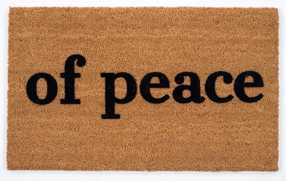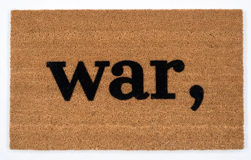 The third Amendment forbids the forcible housing of military personnel in a citizen’s home during peacetime. This Amendment has only been cited several times since it was ratified in 1798. It deals with the relationship between the rights of individuals and the military in both peace and war. The words of this Amendment were created on doormats. A sound recording of knocking accompanies this piece.