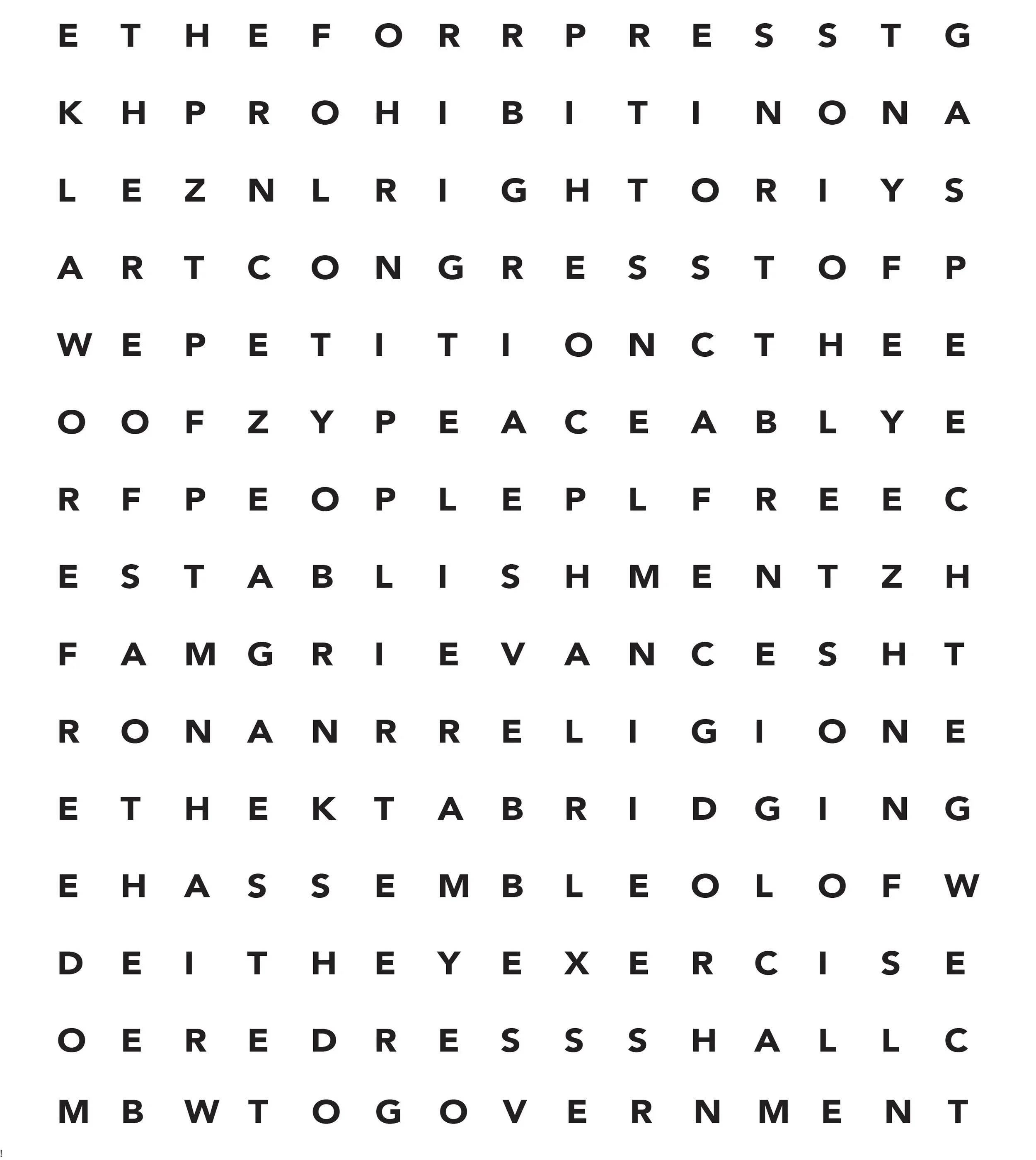 This is a deconstruction of the First Amendment to visually explore the potential breakdown in meaning when language is reduced to its most basic elements. The process of discovery incorporated in the piece is intended to help the viewer reconstruct the meaning for themselves word by word.